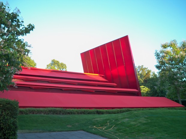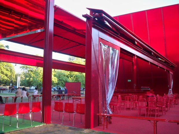 The Pavilion, creating an open public space and a venue for Park Nights, is formed by twelve columns, each representing the 11 past pavilions and the current one, and supporting a floating platform roof.