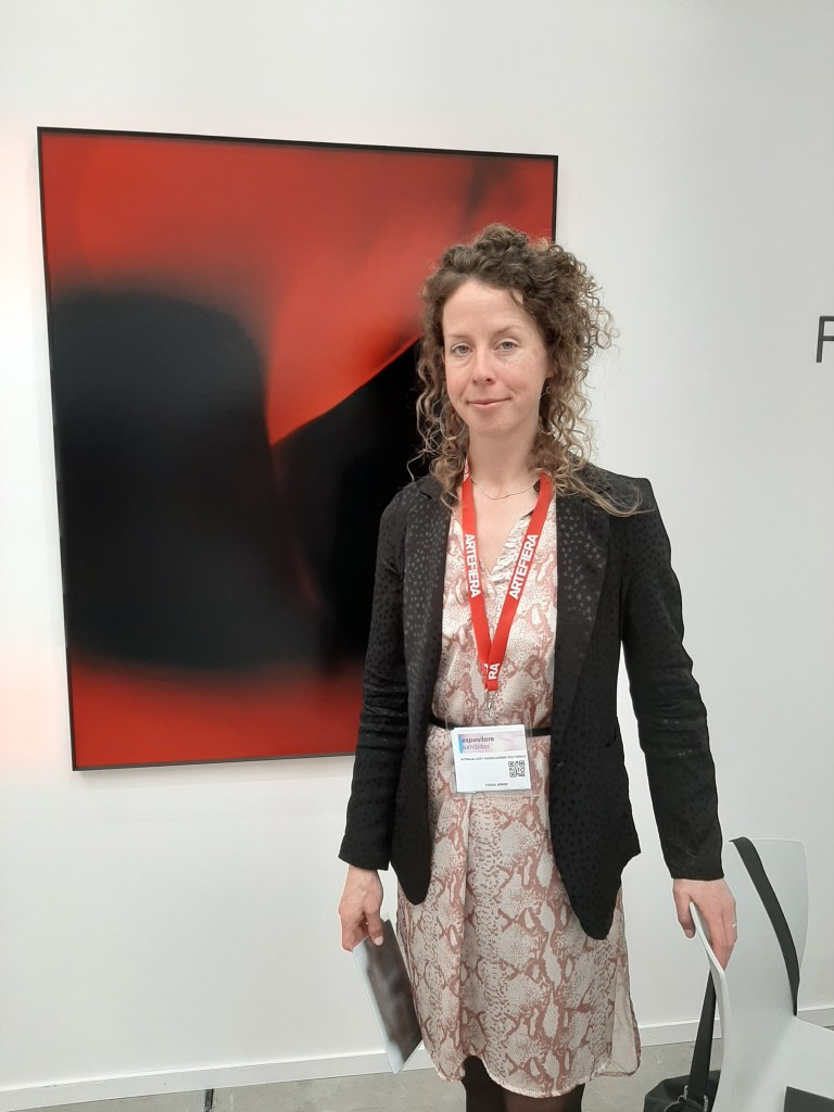 A remarkable display and my personal favourite was It Slips and Falls and is Reborn, the new project from Canadian artist Fiona Annis, showcasing her work at Gallerie Riunite Gallery within the Photography and moving images section. Now in its third edition, this special part of the fair was curated by the Fantom platform (Selva Barni, Benedetta Pomini, Ilaria Speri, Massimo Torrigiani and Francesco Zanot). Fiona Annis (pictured above in front of one of her creations) explores the mysterious aspects of photography integrating elements of chemistry, process, archaic materials and practice. Her reflection on the fragility of life is echoed through her use of the language of light and time, taking flawed or failed artifacts as the starting point for the reconfiguration of errors as generative forces. In the series Hesitation Lines various gesture are inscribed onto the surface of the silver gelatine paper creating fractures and colour fields that recount new histories of creation and disruption and reveal the dualism error-new possibility.