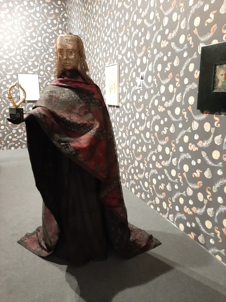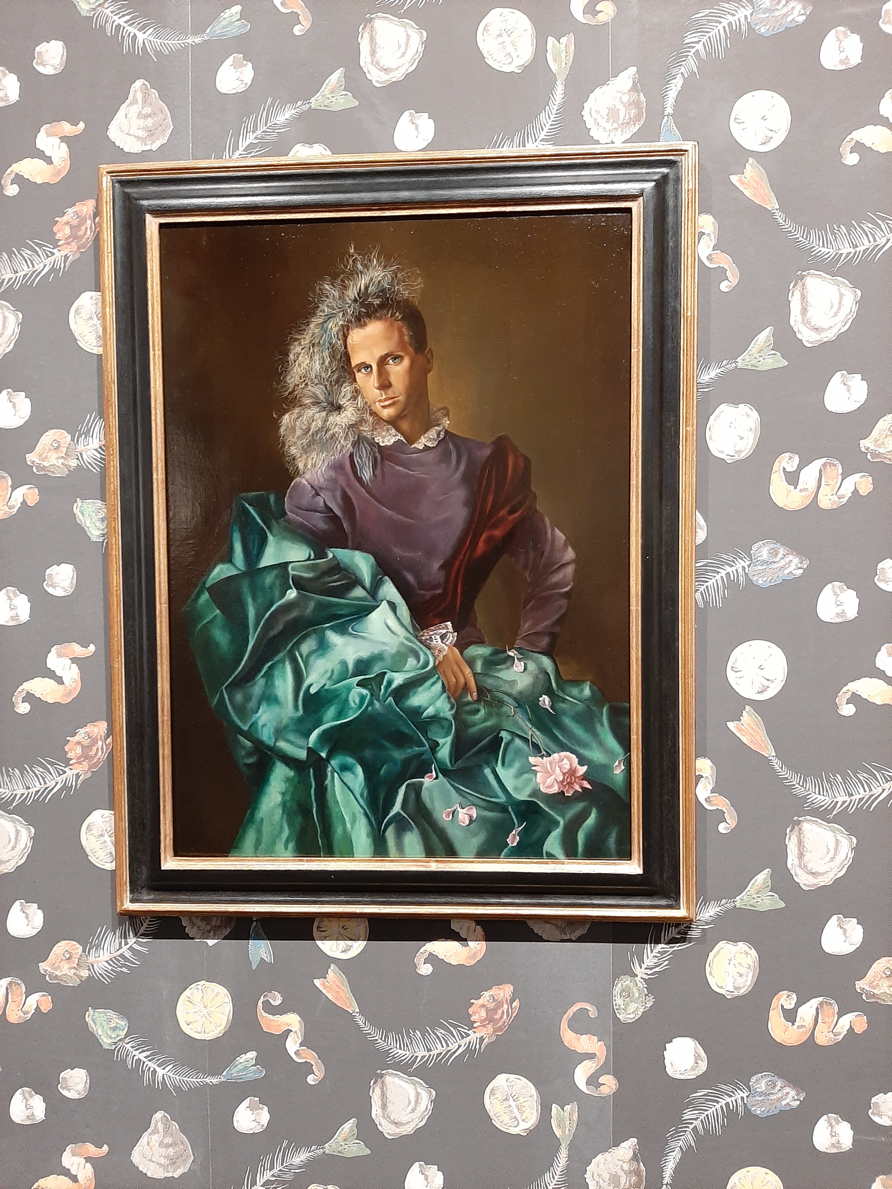 Another remarkable display of the Spotlight section is the solo presentation by Surrealist pioneer Leonor Fini featured at Loeve&Co Gallery, whose booth is covered by a special wallpaper created for this show and showcasing a collection of waste on a black background. The works on display range from 1940 to 1960 and are organised according to different themes: eroticism, skeletons, macabre celebrations, multiple love and gender fluidity. At the front of the showcase a real size 1973 mannequin introduces the visitors to the highlights of the display including the ambiguous portrait of Lino Invernizzi 194-5). Painted in a Renaissance style and set against a dark background, the sitter’s confident pose and eroticism are enhanced by a cascade of silk and velvet and punctuated by the petals of a rose in the foreground.