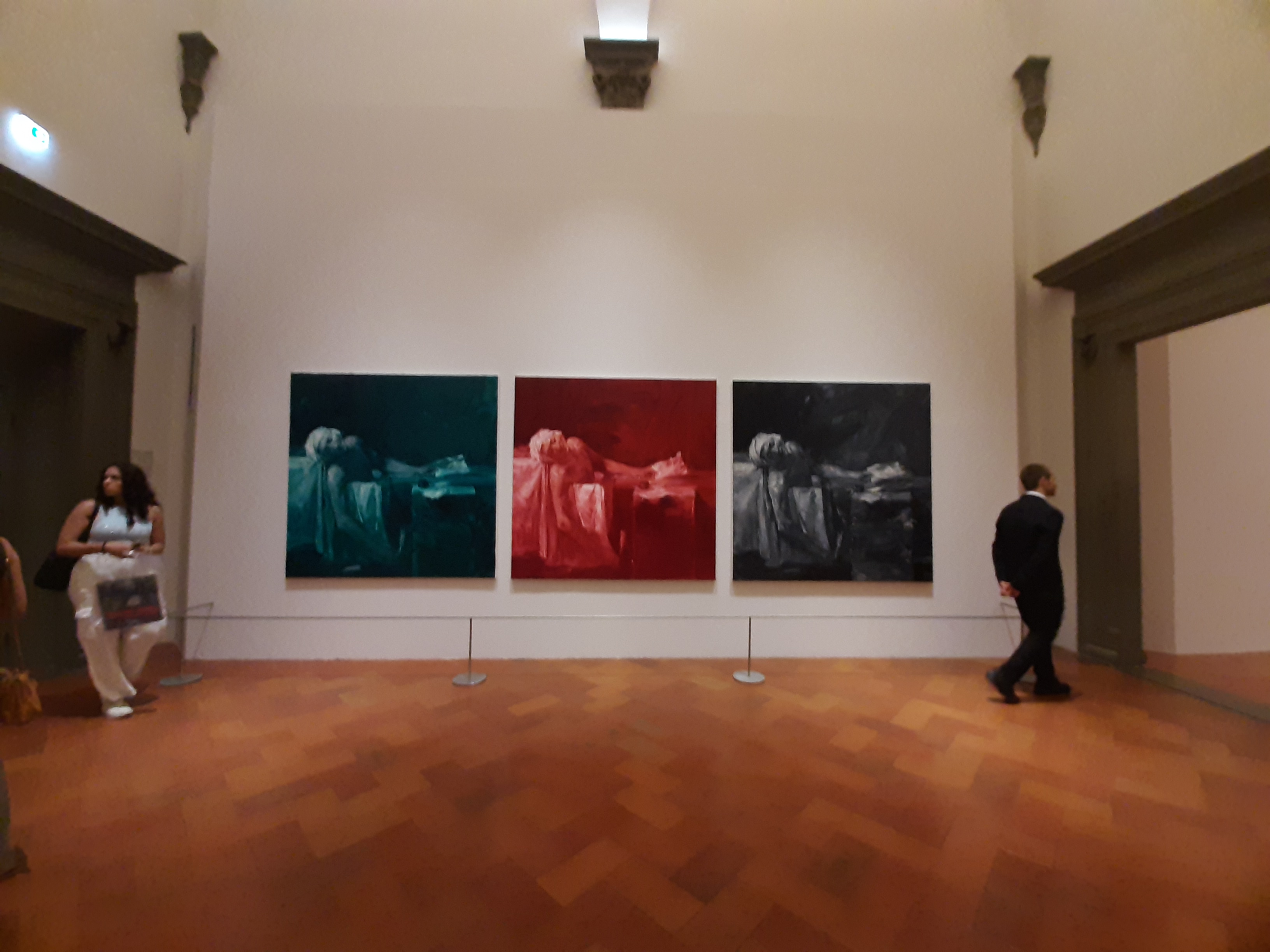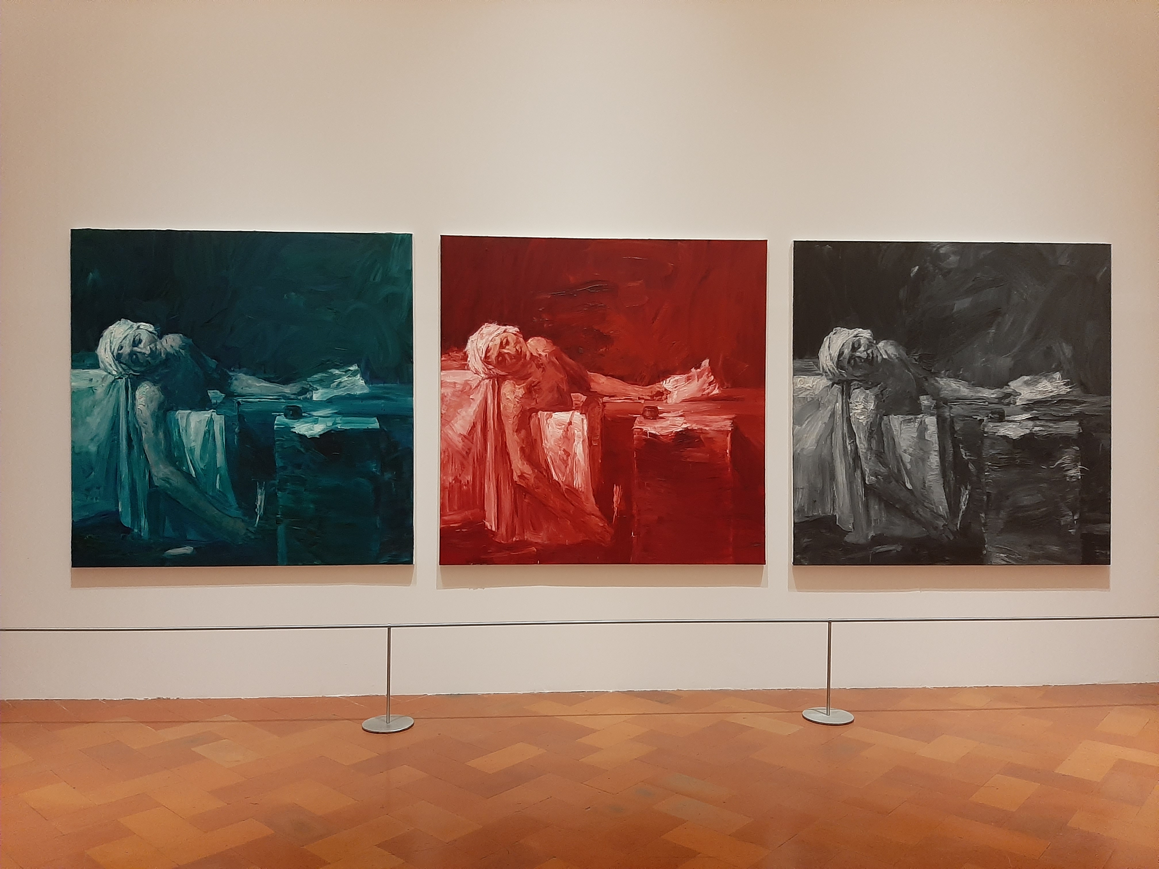 The itinerary continues through a series of re-elaboration of images produced by artists of the past, as is the case of Marat assassiné (The Death of Marat), by Jacques-Louis David, where the image is crystallized and presented in three different hues. The blood red version is placed in the centre of the tryptich, reinforcing the artist’s aim to dramatize the tableau as opposed to the cold and almost clinical original version.