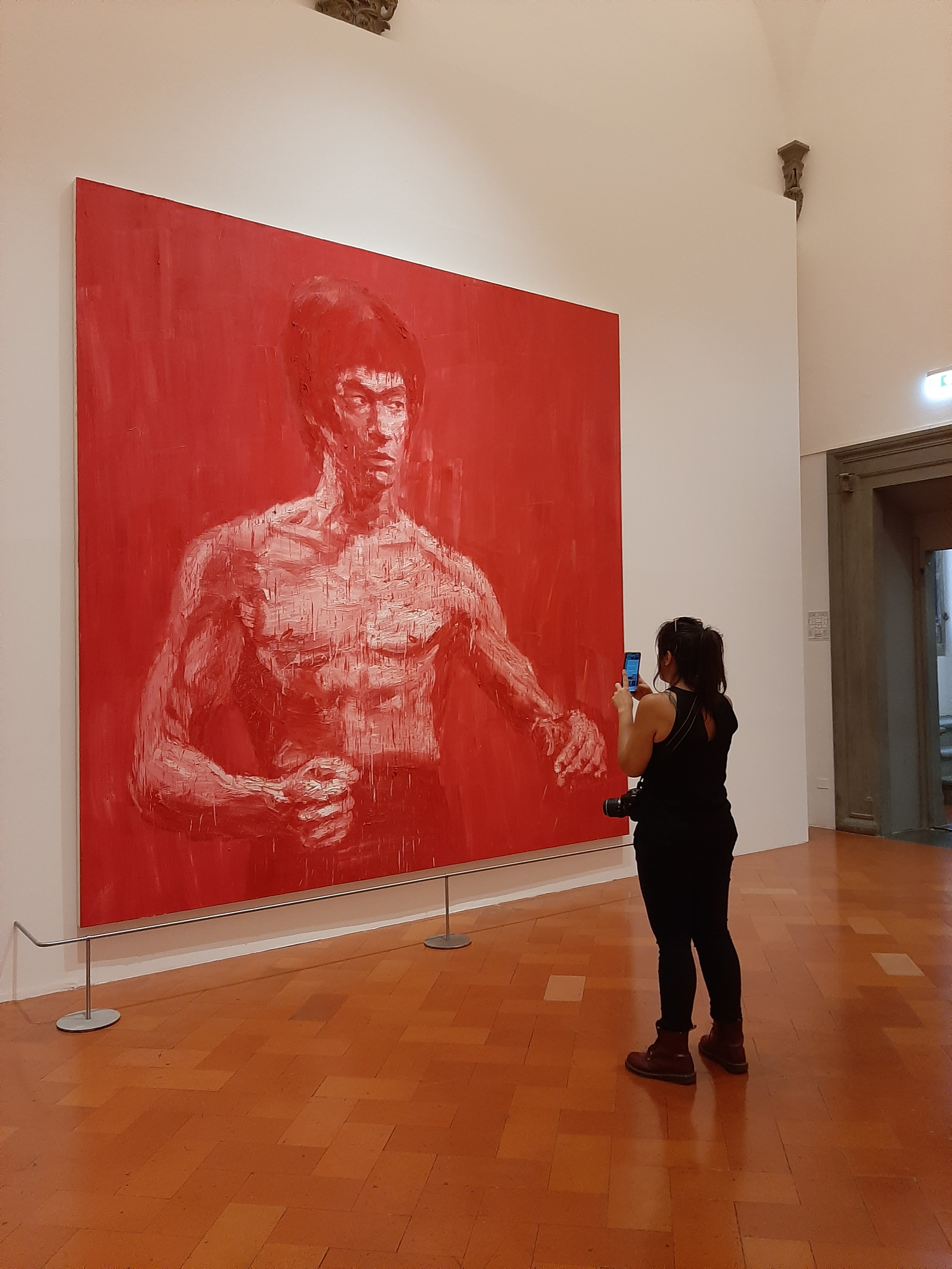 The actor – a mythical figure who perfectly embodies the birth of globalization and is considered the link connecting Hollywood to Hong Kong – is related to the tiger and the dragon, which are both Shaolin Kung Fu forms, one of the most important and ancient styles of Chinese martial arts. The Dragon, a good omen and the emblem of China itself, plays a predominant role in mythology and embodies the concept of yang, the masculine element. Along with the Tiger, it is also one of the twelve signs of the Chinese zodiac, with its long whiskers and its paws ending in sharp claws, though it is the only legendary beast of the twelve. It appears that the precepts of oriental martial arts apply to Yan Pei-Ming’s painting as well.