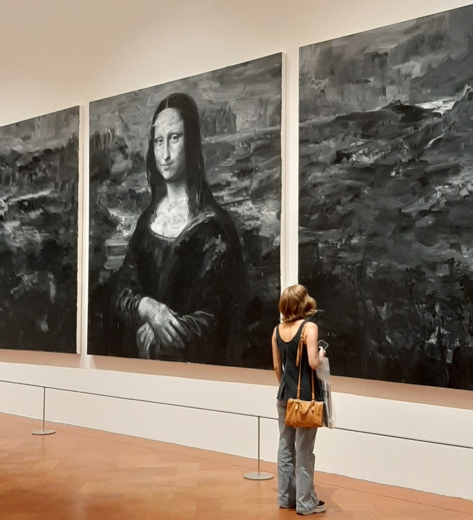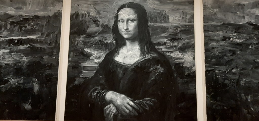 The exhibition opens with a tryptich of monumental self-portaits evoking the crucifixion, where the artist impersonates christ as well as the two thieves. A tribute to her late mother, bringing together her portrait and a deptiction of Buddah, leads the observer to the central room showing “Le Funérailles de Monna Lisa” – the Funeral of Monna Lisa – sided by two canvases, one showing a portait of his father at the hospital and the other his own funeral as a young man. Yan Pei-Ming starts reworking the most famous portrait in the world in 2009, when the Louvre invited him to confront himself with the painting and respond to it. He has prolonged it with two broad landscapes at the sides, adding a personal note to the iconic artworks and addressing the fatherson relationship, a primordial archetipe. As the artist himself recalls: “I didn’t want to produce a painting from a painting. (…) “I wanted to to give her another life, and so the most effectice way to do that was to bury her.” “Bury the myth in order to breath new life into the act of painting.”