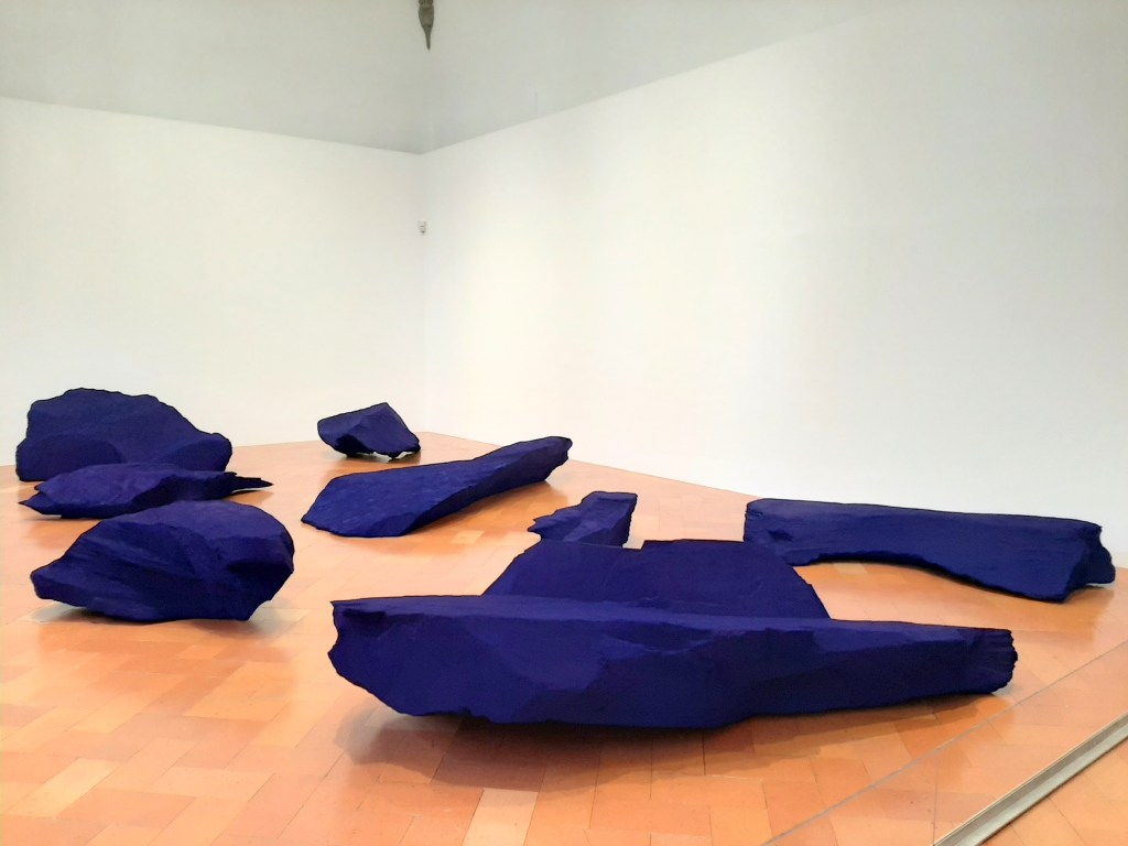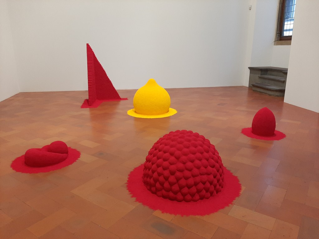 To Reflect an Intimate Part of the Red (1981), a crucial work from the artist’s early career, features a suggestive combination of four red pigment forms and a single yellow object emerging from the floor. Although the smaller scale differentiate these works from later ones, the spatial and architectural effect are similar as their shapes are based on the principles of geometry, specifically concave and convex forms, creating a unique visual effect of depth and intimacy. The artist’s choice of geometric shapes produces a powerful visual experience, stimulating viewers’ curiosity and personal reflections. The role of colour, is also fundamental in the artist’s poetic: primary pigments are not just referring to shade and materiality though they reflect a more spiritual and intimate presence.