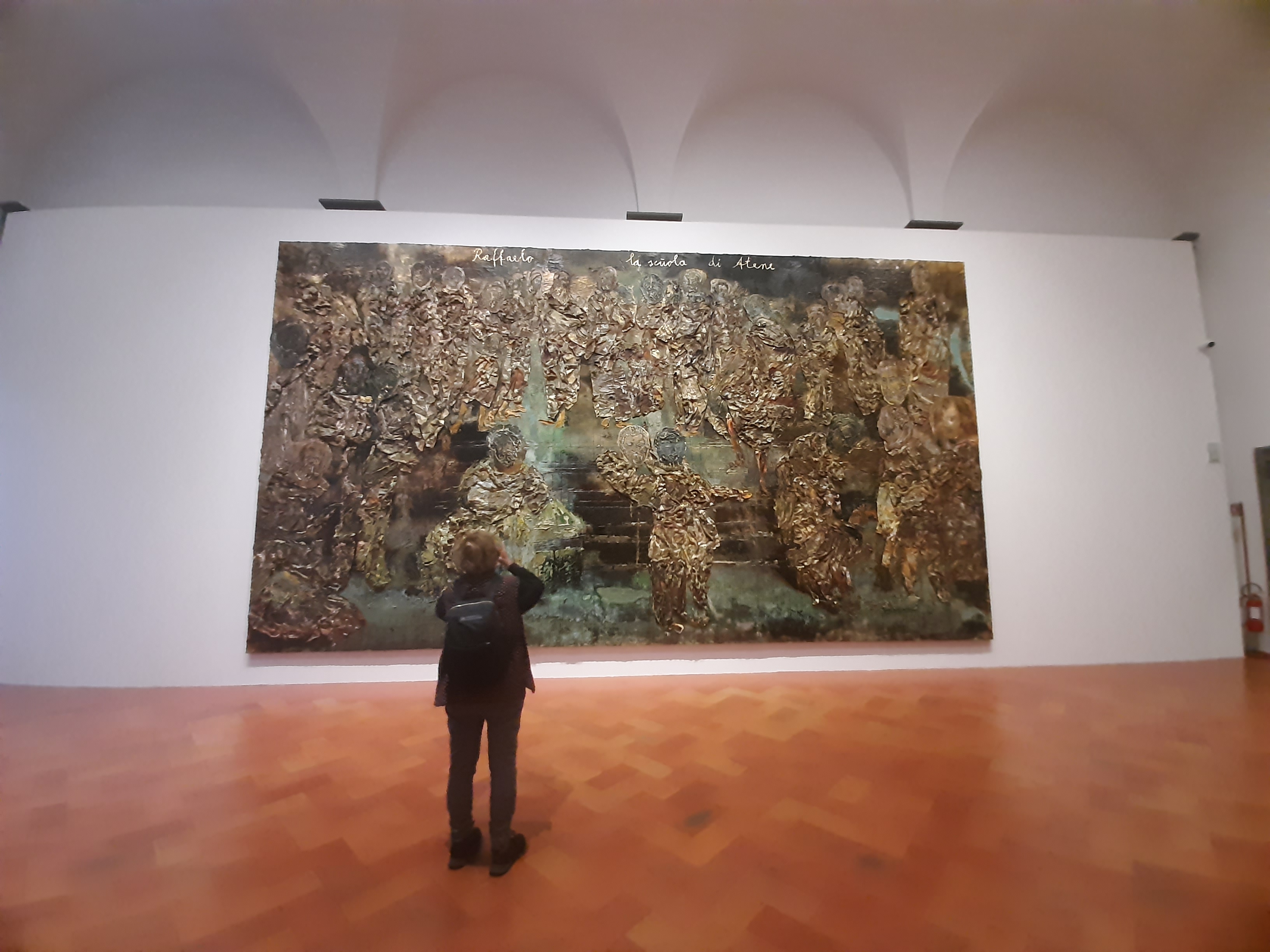 Kiefer affirms that “Painting is philosophy” and this discipline spreads through the exhibit accordingly. One of the rooms is entirely devoted to three recent large-format canvases depicting figures of ancient philosophers: Before Socrates includes Archimedes, Anaximander, Anaximenes and Parmenides, in Ave Maria the heads of pre-Socratic and post-Socratic thinkers are depicted, while La Scuola di Atene is a re-elaboration of the Raphael’s Vatican fresco where the gathering of philosophers embodies the essence of classical knowledge.