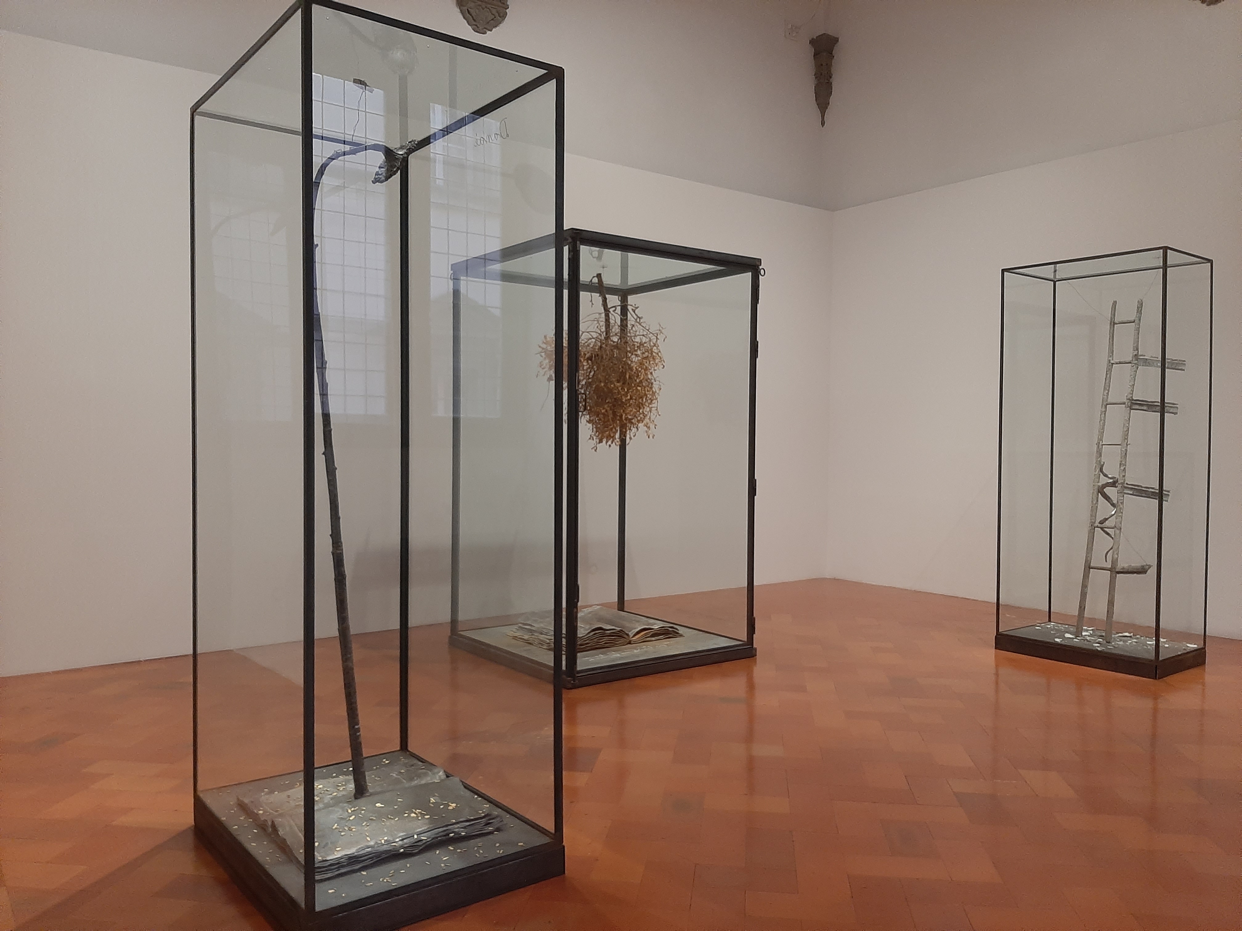 The central rooms present a selection of vitrines, representing a type of artwork which the author has been using for decades and within which he places materials, objects and inscriptions with literary, mythological or philosophical references. His material of choice is lead as it is associated with alchemical themes and processes of metamorphosis, while another key element underpinning Kiefer’s artistic practice is the Kabbalistic thought and Jewish mysticism, he refers to in En Sof, where a ladder unites earth and heaven, alluding to a process of spiritual elevation toward the divine.