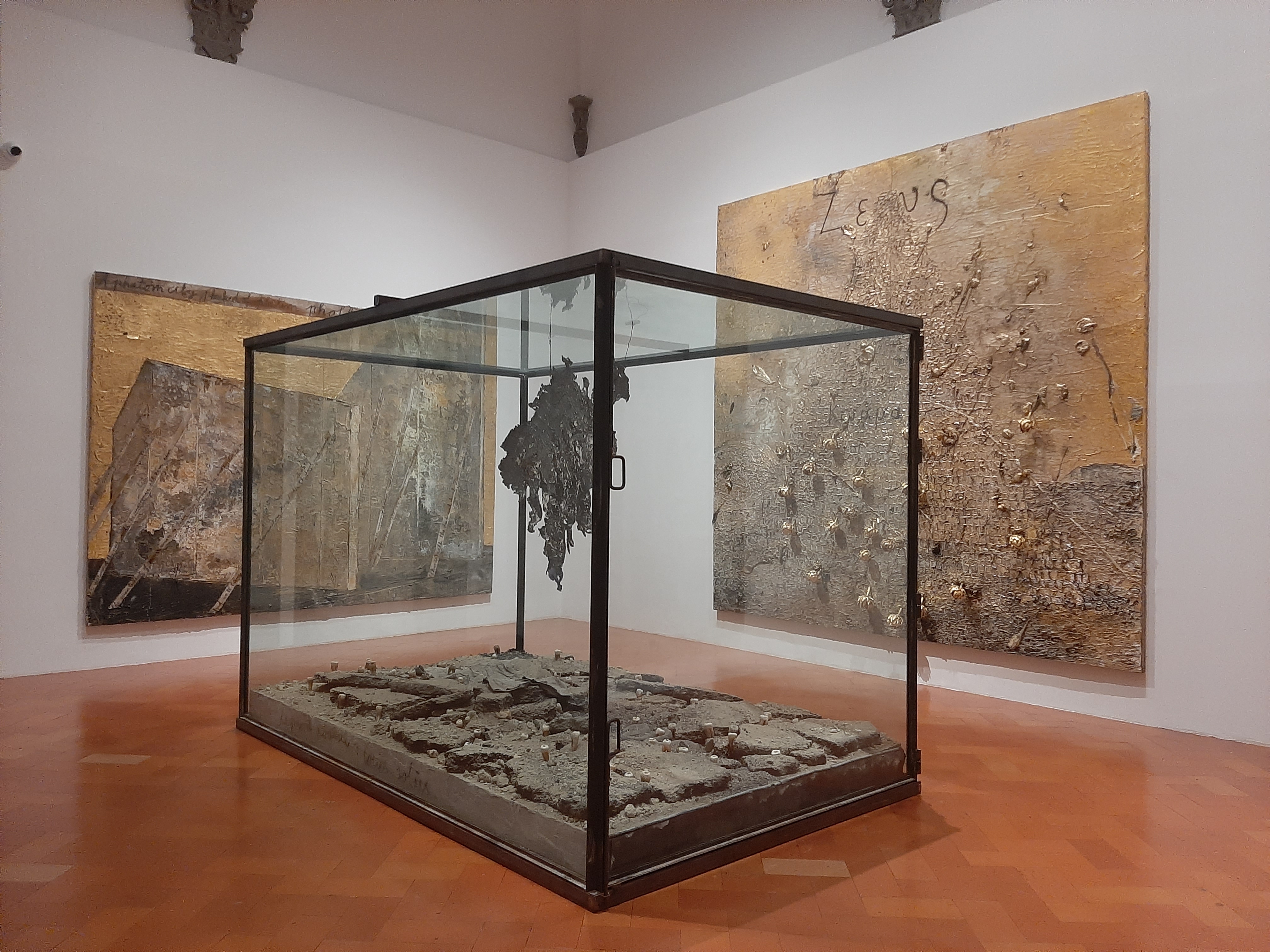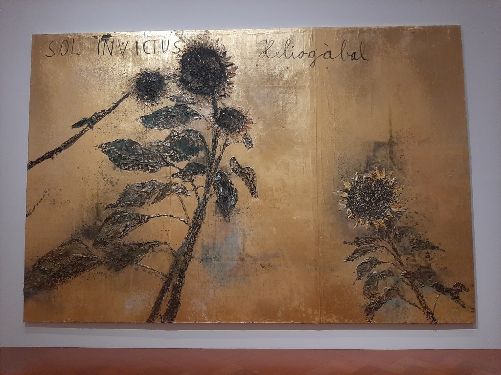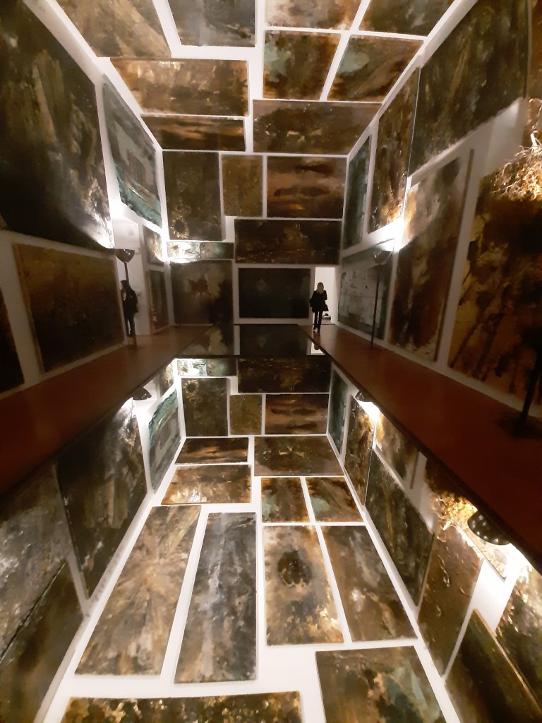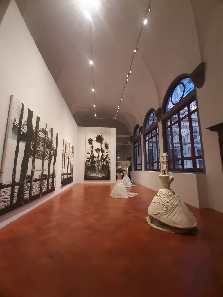 The closing rooms of the exhibit itinerary are by no means the most remarkable and intense ones: the spectacular immersive installation Verstrahlte Bilder (Irradiated Paintings) precedes a display of three large paintings and three sculpture/installations addressing the artist’s personal relationship with the river Rhine as well as mythological and philosophical themes. The last room showcases some of the seminal works from his early period, the photograph of the Occupation actions and the resulting Heroic Symbols, depicting the artist himself wearing his father’s Werhmacht uniform and giving the Nazi military salute against the background of various historical and archaeological sites. The exhibit closes on the verses of Salvatore Quasimodo’s Ed è subito sera, underpinning the importance of poetry, literature and language in Kiefer’s artistic practice: “Ognuno sta solo nel cuore della terra / Trafitto da un raggio di sole / ed è subito sera.” “Everyone stands alone at the heart of the world / pierced by a ray of sunlight / and suddenly it’s evening”.