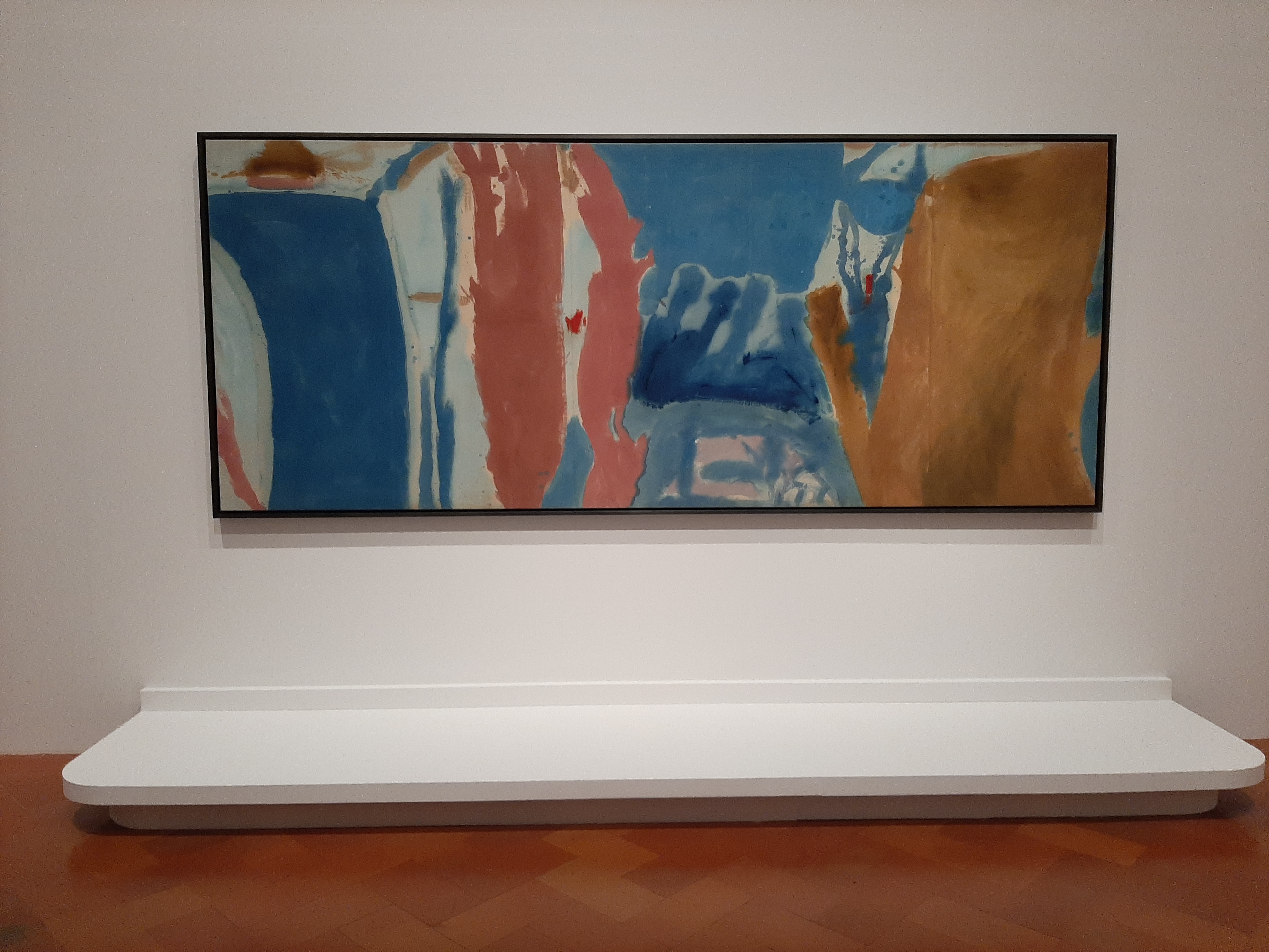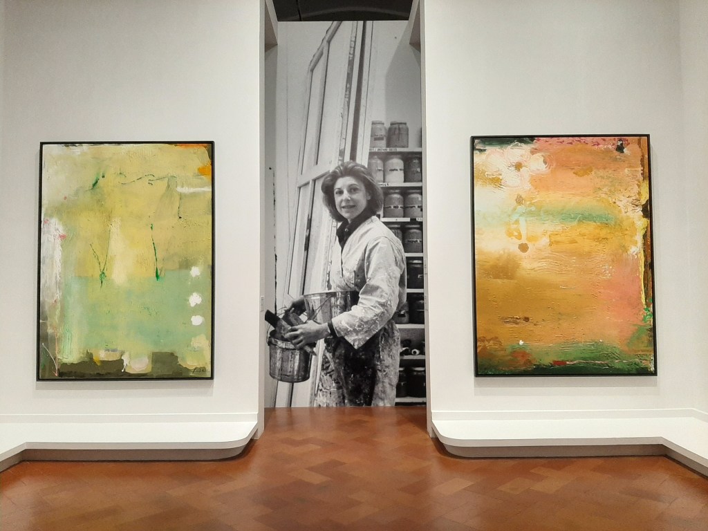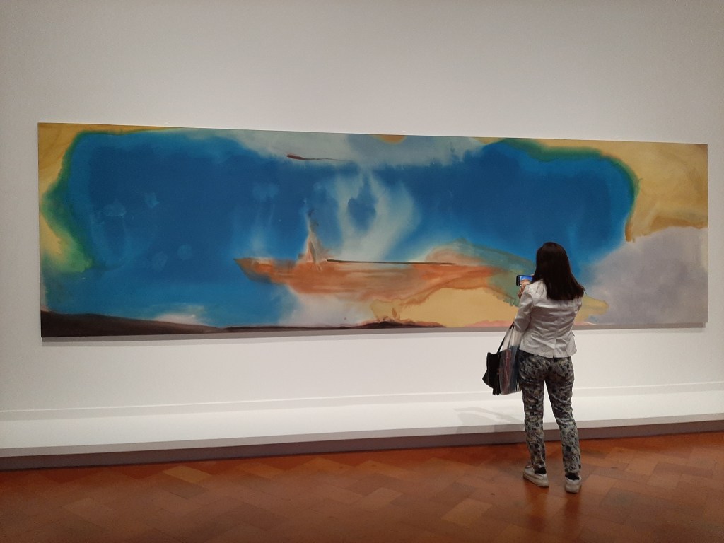Organized chronologically, the exhibition tracks the development of Frankenthaler’s creative practice over six decades, with each room dedicated to a decade from the 1950s to the 2000s. Frankenthaler’s artistic innovations, are displayed with contemporaneous paintings, sculptures, and works on paper by friends, outlining the synergies and affinities between these artists. One of the most remarkable influence of her early career was the encounter with Jackson Pollock‘s radical methods, whose painting process involved circling large canvases spread out on the floor, while using various materials and tools. The “elements of realism abstracted or Surrealism” that she used as description of her reaction to Pollock’s exhibition in 1951, had a profound impact on Frankenthaler’s practice, while her fascination with Pollock’s ground-breaking technique, inspired a new type of Abstract painting known as Colour Field painting.